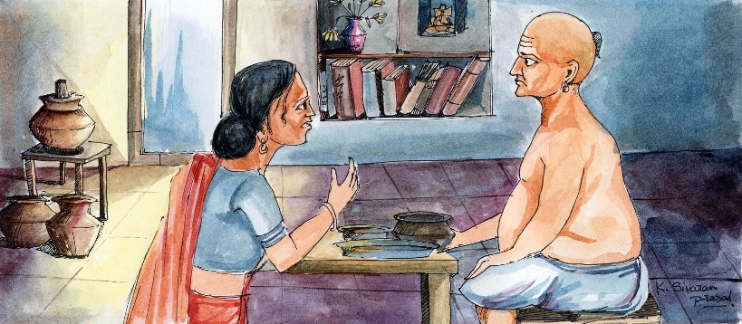 "ఇదేమిటి? 'రాత్రి భోజనానికి ఇలా గంజి ఒక్కటే చాలు ' అని నీకెవరు చెప్పారు? ఈ రోజు ప్రొద్దున్నే నేను కొన్ని మంచి వంకాయలు తెచ్చాను కదా? వాటినైనా వండి ఉండవచ్చునే?" అన్నారాయన భార్యతో.
