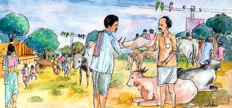 'ఎలాగో ఒకలాగా కష్టపడి డబ్బు సమకూర్చుకొని, మంచి కాడెద్దులు కొనుక్కోవాలి' అని కలగనేవాళ్ళు వాళ్ళు. కొన్నాళ్ళకు తగినంత డబ్బు సమకూరింది. "ఇక ఎద్దులు కొనుక్కుందాం" అని రంగయ్య సంతకు బయలుదేరాడు.