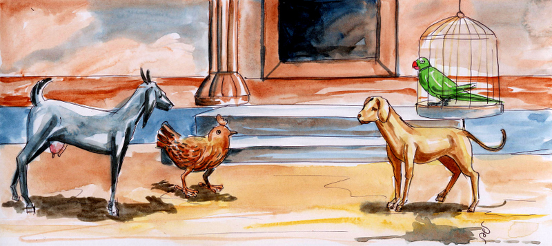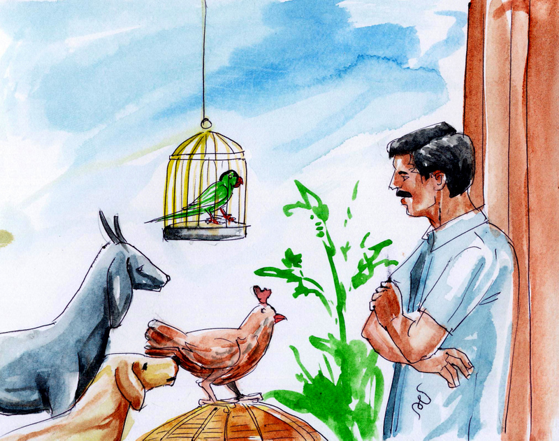 ఒక ధనవంతుడి ఇంట్లో ఒక కుక్క, మేక, కోడి, రామచిలుక పెరుగుతున్నాయి.