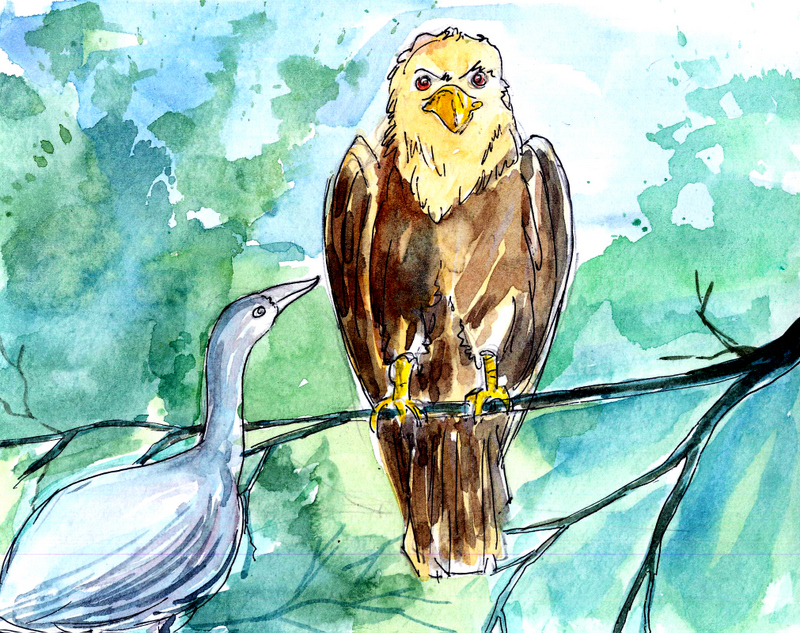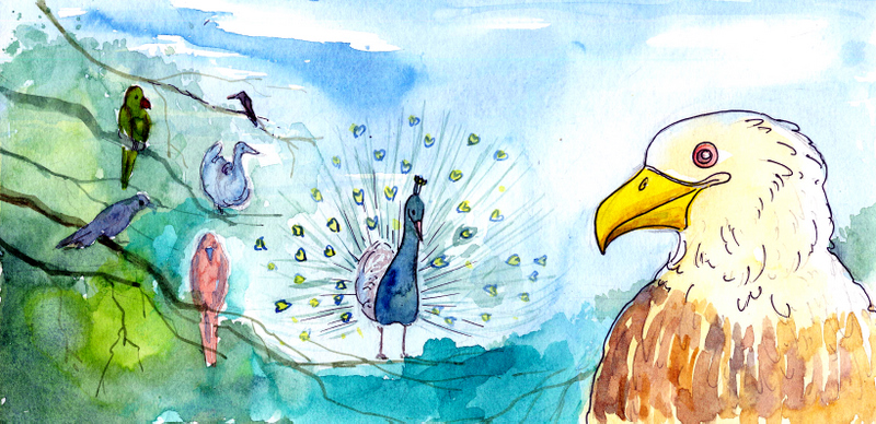 "ఏం, చిలుకా, నువ్వేమీ చెప్పవా, మీ జాతి గురించి?" అన్నాడు గరుడుడు, ముందు కూర్చొని తల ఎగరవేస్తున్న చిలుకతో. "రాజా! మనుషులు పలికిన మాటలన్నిటినీ, ఉన్నవి ఉన్నట్లు తిరిగి పలుకుతున్నాం మేం; వాళ్ళకు మంచి స్నేహితులం. వాళ్ళ పిల్లలు ఎవరైనా ముద్దుగా మాట్లాడితే వాటిని 'చిలుక పలుకులు' అని అంటుంటారు! వాళ్ళు మాకు అరమాగిన పండ్లు తెచ్చి పెడుతుంటారు; వాళ్ళ తోటల్లో మేం కొరికిన పండ్లను, "అబ్బ! చిలుక కొరుకుడు!" అని సంతోషంగా తింటారు పిల్లలు. అందువల్ల మాకెవ్వరూ హానిచేయరు. పంచెవన్నెల రంగే మా అందం, మా ఆకర్షణానూ! మాకేమీ కష్టాలు లేవు" అన్నది చిలుక గర్వంగా.