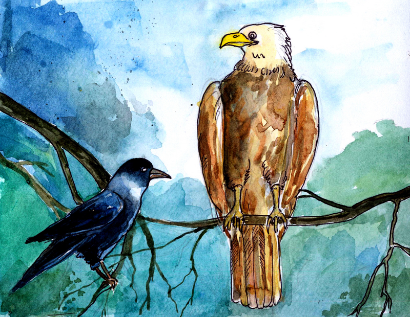 గరుడుడు అన్నిటినీ చూసి "సరే, అంతా వచ్చినట్లేనా? ఇక సమావేశం మొదలెడదామా?" అనగానే పక్షులన్నీ తలలాడించాయి. "మనం మన జాతుల గొప్పతనం గురించి మాట్లాడుకుంటున్నాం; కాకి దగ్గరికి వచ్చి ఆగాం" గుర్తు చేశారు రాజుగారు. అయినా ఎవ్వరూ మాట్లాడలేదు.