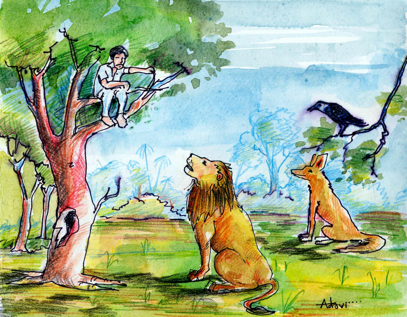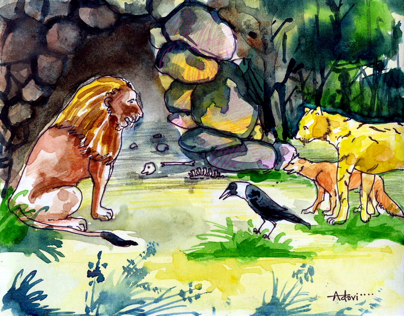 అదివిని పులి- "కాకి కంటే నువ్వు కొంచెం పెద్ద దానివే; అయినా నీ మాంసం కూడా రాజుగారి ఆకలిని తీర్చేందుకు సరిపోదు. నేను భోజనమౌతాను రాజుగారికి!"అన్నది నక్కతో.