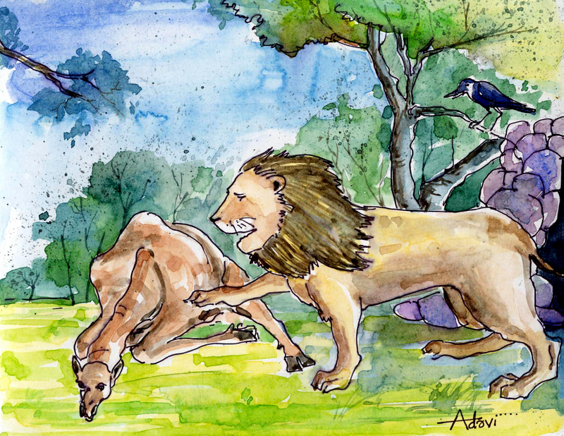 సింహం "సరే "అని, "అతను - అదిగో, ఫలానా సమయానికల్లా వచ్చేస్తాడు- ఉండండి" అన్నది.