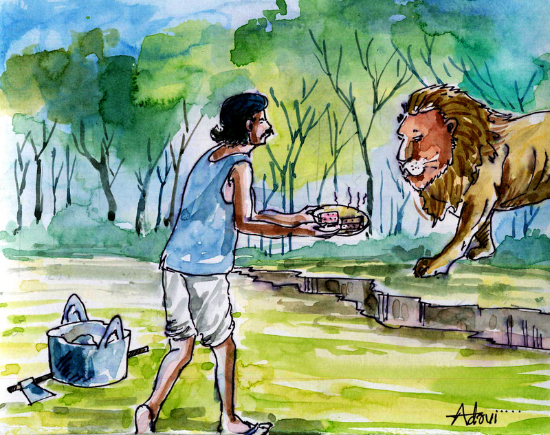 అతను వెంటనే దాని ముందు సాగిలపడి మ్రొక్కి , పలు విధాలుగా దాని శౌర్యాన్ని ప్రస్తుతించి, దాని అనుమతి తీసుకొని ఇంటికి పోయాడు.