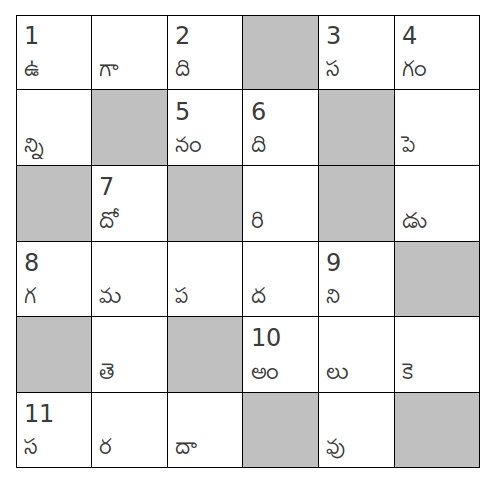 1. ఆంధ్ర రాష్ట్రపు నృత్య రీతి (4) 4. అందంగా మలచిన శిల (2) 5. తేడా (3) 6. కొండను తొలిచి చేసే త్రోవ (3) 8. స్నేహం (3) 10.కౌరవులు-పాండవుల కథ తిరగబడింది(3)