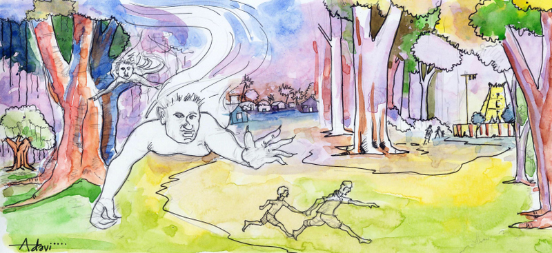 దయ్యాలు రెండూ మర్రి ఊడల్ని వదిలేసి వాడి దగ్గరికి వచ్చాయి కత్తెరలు, దువ్వెనలు చేతబట్టుకొని. "ఓహో ఓహో! బుజ్జిబాబు వచ్చాడే, గుండు చేయించుకోటానికి! నీకు ఏ రంగు దువ్వెన కావాలి నాన్నా?" అంది ఒక దయ్యం ఇకిలిస్తూ.