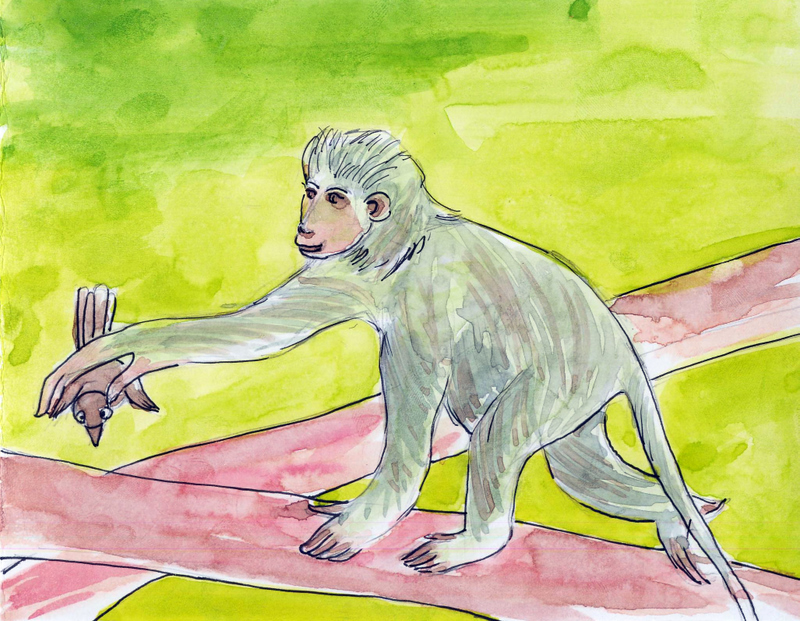 వాటికి దగ్గర్లోనే ఉన్నదొక పిట్ట- దాని పేరు సూచీ ముఖం- అది వాటిని చూసి నవ్వింది: "అయ్యో! వెర్రి కోతులారా! ఇవి నిప్పు కణికలు కావు- మిణుగురు పురుగులు. కావలిస్తే చూడండి. అదిగో- అక్కడ- ఆ నల్ల చెట్టు దగ్గర నిజం మంట కానవస్తున్నది. అక్కడికి పోయి చలి కాచుకోండి" అన్నది.