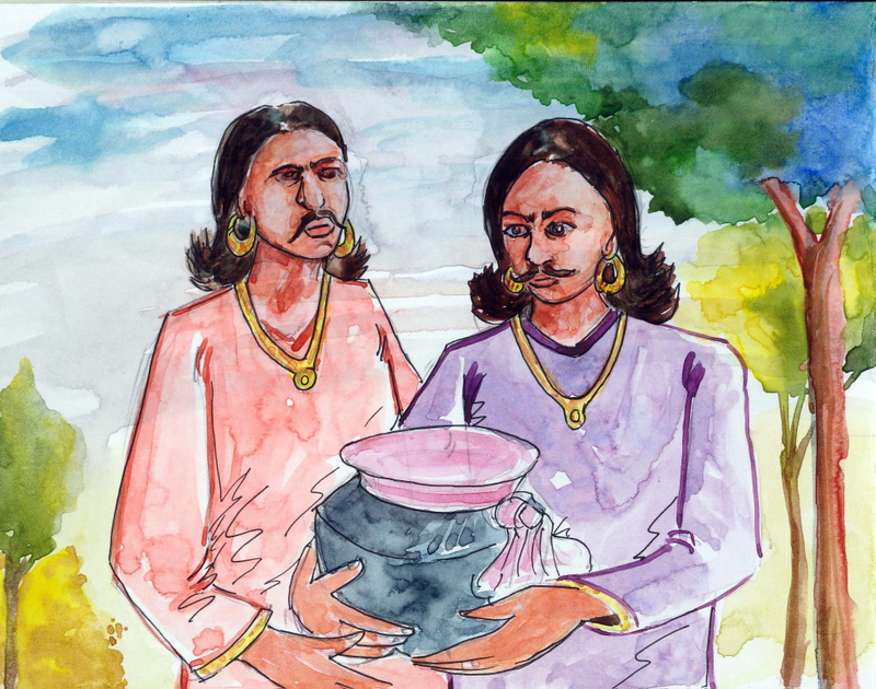 ఇద్దరూ తమ డబ్బునంతా ఒక బిందెలో పెట్టి, ఊరి దరి దాపుల్లోకి చేరగానే అక్కడున్న ఒక మర్రిచెట్టు క్రింద, ఎవ్వరూ చూడకుండా గుట్టుగా దాన్ని పాతిపెట్టి, ప్రశాంతంగా తమ తమ ఇళ్లకు వెళ్ళిపోయారు.