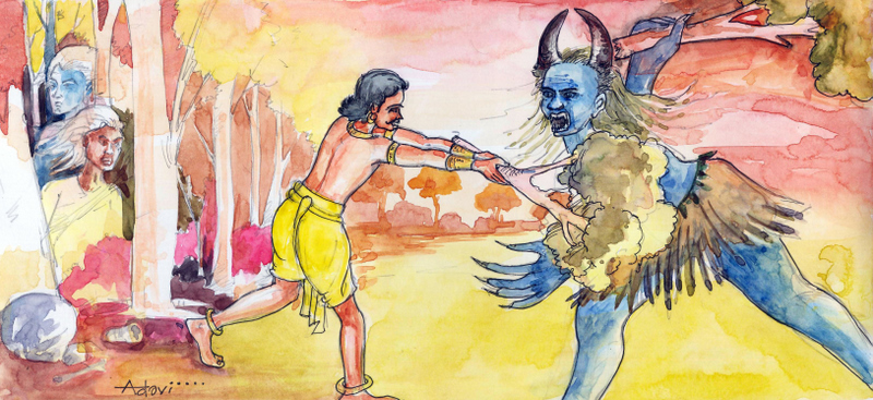 "నా అక్కల కోసం వచ్చానోయ్, నీకేం కష్టం?!" అని రాక్షసుడి మీసం పట్టుకొని గిర గిర తిప్పి విసిరేశాడు రాజకుమారుడు. ఆ దెబ్బకు రాక్షసుడు దూరంగా వెళ్ళి పడ్డాడు.