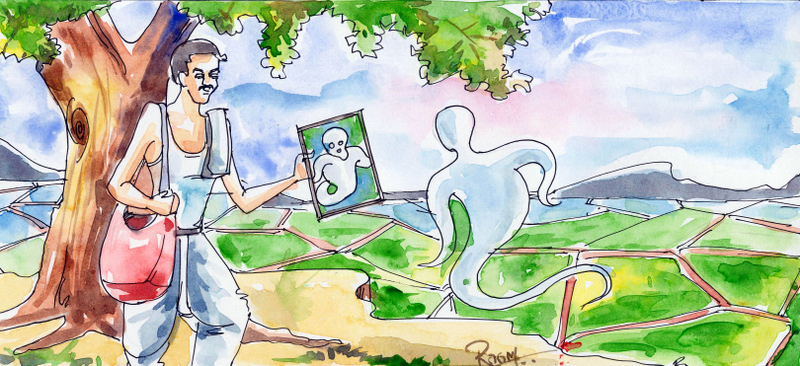 మంగయ్య తన సంచీలోంచి అద్దం తీసి చూపించాడు. ఆ అద్దంలో ఏముందని చూశాడు రాక్షసుడు. వాడికి అందులో తన ముఖమే కనబడ్డది! తను నోరు తెరిస్తే అదీ తెరుస్తున్నది. తను ఇకిలిస్తే అదీ ఇకిలిస్తున్నది! దాంతో వాడికి 'అది తన ఆత్మే' అని నమ్మకం ఏర్పడిపోయింది.
