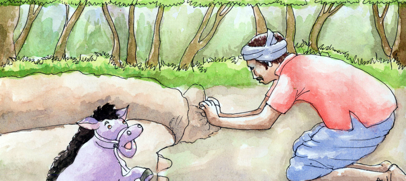 ఆ గందరగోళంలో అతను తన కాళ్ళ ముందున్న బండ రాయిని చూసుకోలేదు- మరుక్షణం చాకలి నేల మీద వెల్లకిలా పడిపోతే, అతని గాడిద మాత్రం రోడ్డు ప్రక్కగా ఉన్న- నీళ్ళులేని బోడబావిలో పడిపోయింది!