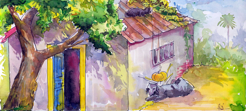 మా ఇల్లు బోదగడ్డి కొట్టం. కొట్టం మీద నిండుగా గుమ్మడి తీగ అల్లుకుంది. దానికి ఒక లావుపాటి గుమ్మడికాయ కాసింది. కొట్టం చూరు కిందేమో, ఒక మేక కట్టేసి ఉంది.