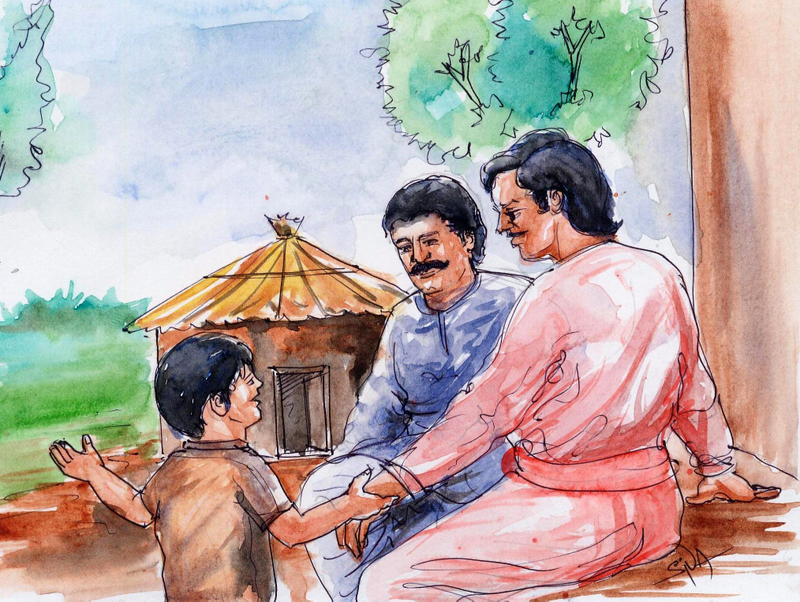 ఒకరోజు ఇంద్ర పాలితుడు ధనగుప్తుడితో ముచ్చట్లాడుతూ ఉండగా వీధిలో "పండ్లమ్మా పండ్లు!" అని పండ్లమ్ముకునేవాడు ఒకడు అరిచాడు. ధనగుప్తుడి కొడుకు, చిన్నవాడొకడు, కాళ్ళ గజ్జెలు ఘల్లు ఘల్లుమంటుండగా తప్పటడుగులు వేస్తూ వచ్చి గునుస్తూ, ఏడుస్తూ తండ్రిని పట్టుకొని లాగుతూ, పండ్లు కొనిమ్మని మారాం చేయటం మొదలుపెట్టాడు.