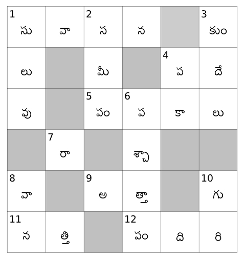 1. రక్తం పీల్చుకునే పురుగు (3) 2. వానా కాలంలో కాళ్లకి అంటుకునేది(3) 3. రాళ్ళు- ఏకవచనం (2) 4. 'వ్రాత'ని ఇలా రాస్తారు (2) 6. గజిబిజిగా 'రామచరితం'(5) 8. ప్రయాణం (3) 10. చలన చిత్రం (2) 11. ఇది కాదు (2)