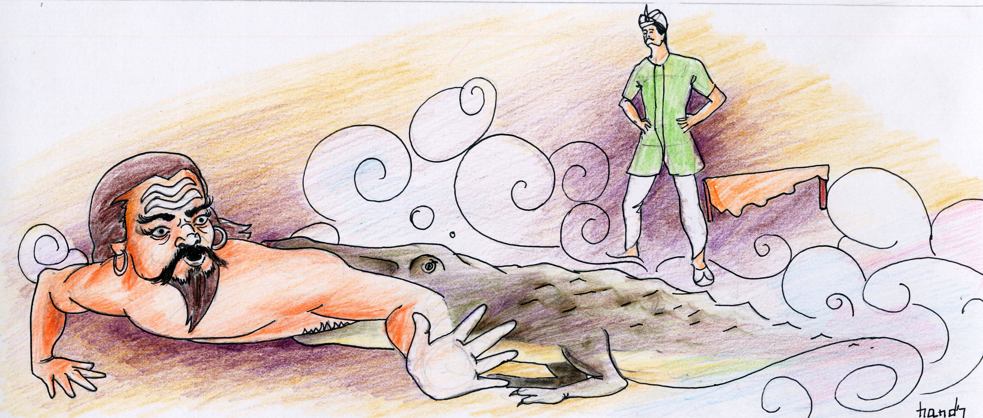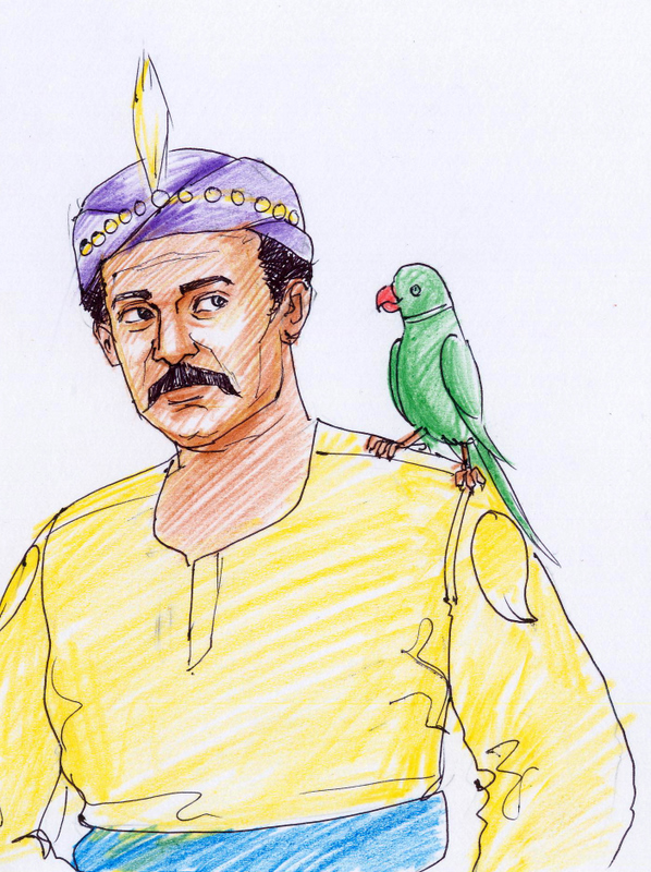 "మహారాజా! రాయిని విసరండి!" అంది చిలుక. తన అంగీలో దాచుకున్న రాళ్ళల్లో మొదటిదాన్ని గురిచూసి మాంత్రికుడిపై విసిరాడు రాజు. అది మంటలను పుట్టించింది. అయినా వాడు మంటలను దాటుకుంటూ పెద్ద పెద్ద అంగలు వేసుకుంటూ వస్తున్నాడు. రాజు రెండవ రాయిని విసిరాడు. లోతైన నీళ్ళ అగాథం ఏర్పడింది. వాడు నీళ్ళలో నుంచి కూడా రావడం చూసిన రాజు మూడవ రాయిని విసరగానే, పే..ద్ద మొసలి పుట్టింది- మాంత్రికుడిని గుటుక్కున మింగేసింది అది!