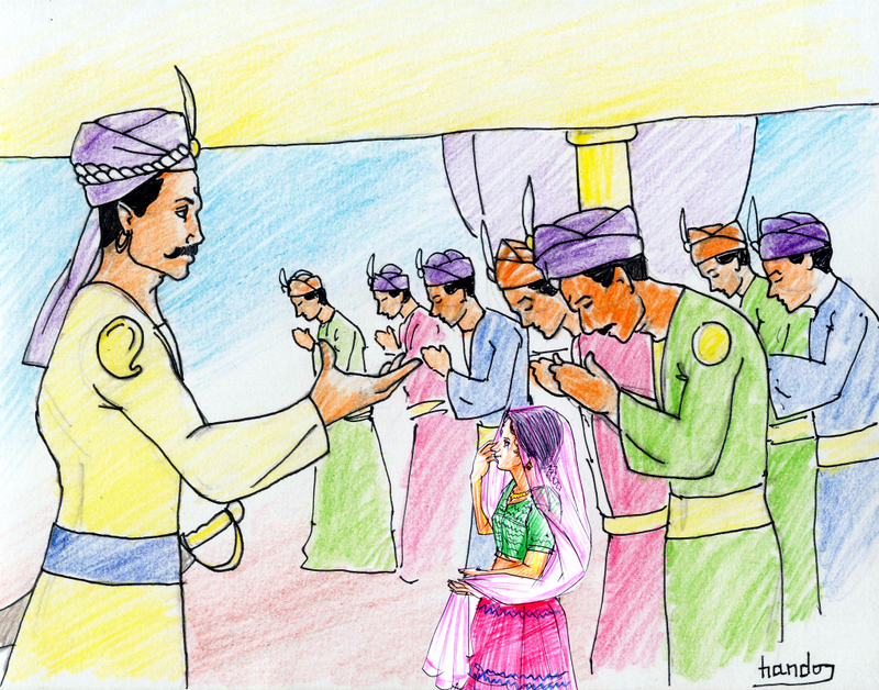 దురాశ ఎక్కువై, చెడు దారి పట్టి, లోకకంటకుడిగా మారాడు నా కుమారుడు. నా అంతట నేను వాడిని ఏమీ చేయలేకపోయాను; కానీ ఈ పాపను మటుకు వాడి బారిన పడకుండా దూరంగా ఉంచి సాకుతూ వచ్చాను ఇన్నాళ్ళూ. ఇంక నేను ప్రశాంతంగా తపస్సు చేసుకుంటాను. నీకు అభ్యంతరం లేకపోతే, ఈ పాప బాధ్యత కూడా ఇకమీద నీకే ఇవ్వాలని ఉంది. నీ కుమారులకూ ఓ చెల్లి దొరికినట్లు అవుతుంది..ఏమంటావు?" అన్నది అవ్వ, రాజుతో.