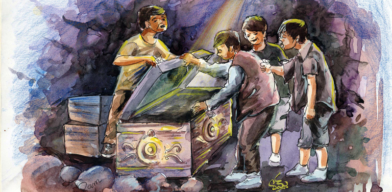 "ఈ పెట్టెలన్నిటికీ తాళాలున్నై..ఏవైనా పెట్టెలు తెరచి ఉన్నాయేమో చూడండి" అన్నాడు రాజు జాగ్రత్తగా, ఆలోచిస్తూ. వెతికితే ఒక పెట్టెతాళం తెరచే ఉన్నది- నలుగురూ కలిసి ఆ పెట్టె మూతను ఎత్తారు- దాని లోపల, నిండా నోట్ల కట్టలు!