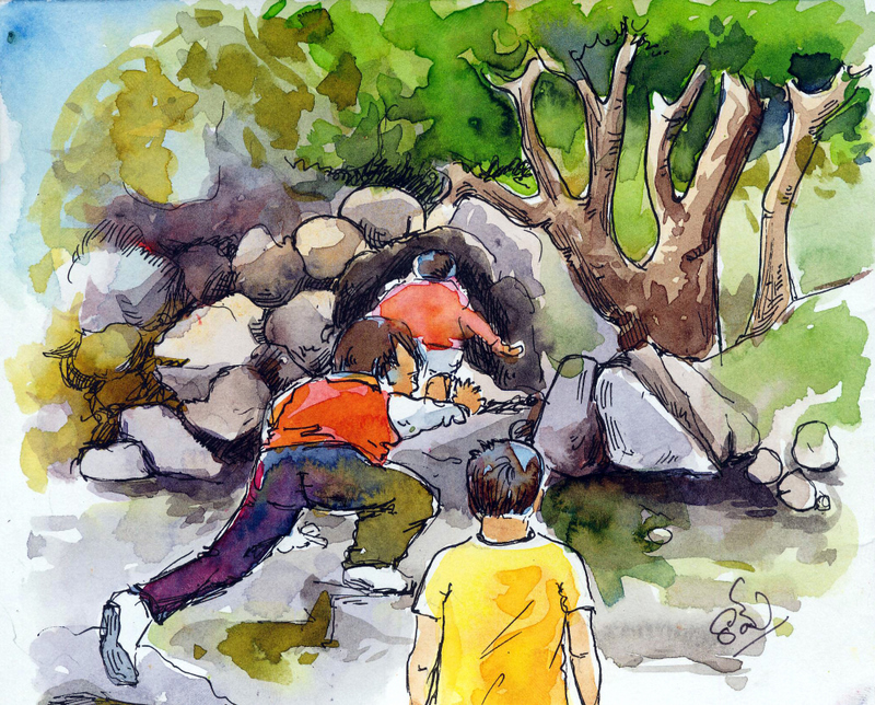 హంపీ మామూలుగా చాలా వేడి ప్రదేశం. అయితే కొన్నాళ్ళుగా వానలు పడుతున్నట్లున్నాయి; పచ్చటి గడ్డి పరచుకొని ఉన్నది కొండల్లో అంతటా . మధ్యాహ్నం భోజనాలు కాగానే చుట్టు ప్రక్కల ప్రాంతాన్ని అలాగ చుట్టి వచ్చేందుకు పిల్లలకు కాస్తంత సమయం చిక్కింది. ఇంకేముంది, రాజు, సతీష్, సంజయ్, రిత్విక్- నలుగురూ బయలు దేరారు. అంగళ్ళు దాటుకొని, వరాహ స్వామి గుడి వెనకగా, ముళ్ళ పొదల్ని తప్పించుకుంటూ, కాలిబాట వెంబడి గబగబా నడుస్తూ పోయారు- ఓ చిట్టికొండను ఎక్కుకుంటూ.