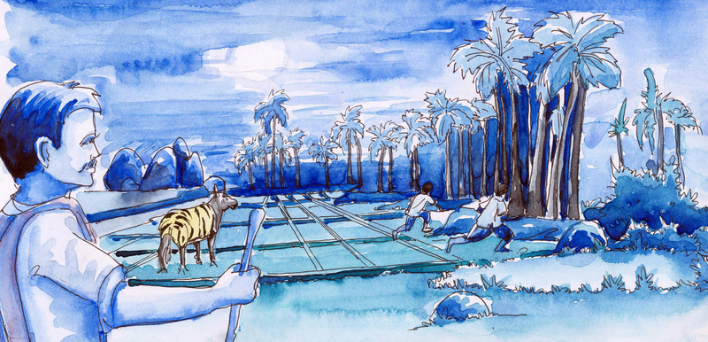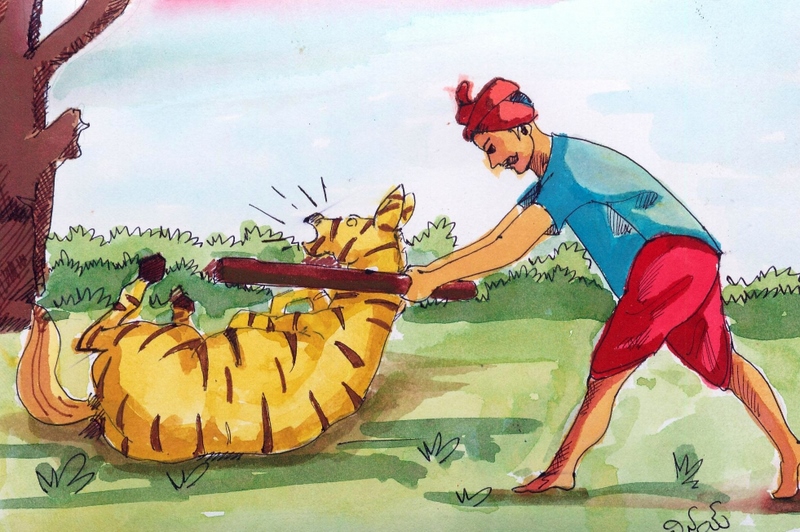 ఇట్లా కొంత కాలం గడిచింది. అడవికి దాపులనున్న పొలపుకాపు ఒకడు 'తన పొలం అట్లా నశించిపోతున్నదే' అని చాలా బాధపడ్డాడు. బాగా ఆలోచించి, చివరికి మనసును గట్టిపరచుకున్నాడు. గుండెను రాయి చేసుకున్నాడు; 'సాహసోపేతమైన పని చెయ్యాల్సిందే- పులి అంతు తేల్చాల్సిందే' అనుకున్నాడు. ఒకనాటి రాత్రి బూడిదరంగు దుప్పటిని ఒంటినిండా కప్పుకొని, పొలంలోకి దూరాడు. ఆ పొలానికి అవతలివైపున ఉన్న ఒక పెద్ద చెట్టు మాటున, కంటి రెప్ప వాల్చకుండా నిలబడ్డాడు- ఒక బాణాన్ని ధనుస్సుకు పూన్చి.