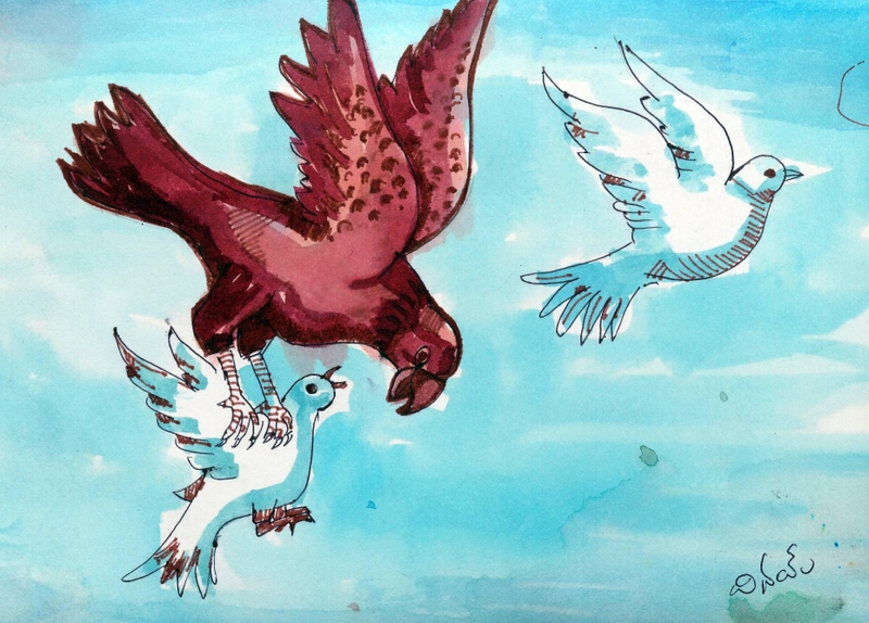ఇక ఆ డేగ కూడా పగబట్టిన దానికిమల్లే మరునాడు ఉదయాన్నే- ఇంకా సూర్యుడు ఉదయించకనే- వచ్చి, ఆలయంనుండి బయటికి వెళ్ళేవైపుగా ఉన్న ప్రహరీగోడ మీద చూపు నిలిపి, మాటు వేసి కూర్చున్నది. సూర్యోదయం కాగానే పక్షులు రెండూ ఎప్పటి మాదిరి ఆహారంకోసం బయటికి వచ్చి ఎగిరి పోబోయాయి- అయితే ఆ నాటితో ఆడ-పావురానికి మగపావురంతో ఋణం తీరి-పోయింది కాబోలును- డేగ గబుక్కున వచ్చి మగ పావురాన్ని బలంగా తన ముక్కుతో కరచుకొని పోయి, ఆనాటి భోజనానికి దానినే తొలి ముద్దగా చేసుకొని, ఇష్టంగా భోంచేసింది.