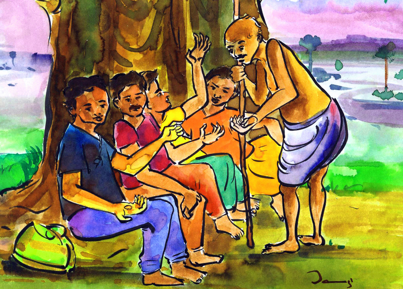 మధ్యాహ్నం కాగానే నలుగురు కళాకారులూ భోజనం చేయడానికి కూర్చున్నారు. ఇంతలో ఒక ముష్టివాడు వాళ్ళదగ్గరికి వచ్చాడు- మొదటి వాడిని (శిచిచక్రవర్తి) అడిగాడు "అయ్యా! నాలుగు రోజులుగా తిండిలేదు, కనికరించి కొంచెం అన్నం పెట్టండి బాబూ" అని.