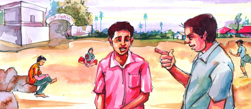 వెంటనే భీమయ్య కోపంతో చలమయ్య ఇంటికి వెళ్ళి "నిజంగా జరిగినదేమిటో చెప్తావా, లేదా?!" అని గట్టిగా అరుస్తూ చలమయ్య మీదికి చెయ్యెత్తాడు.