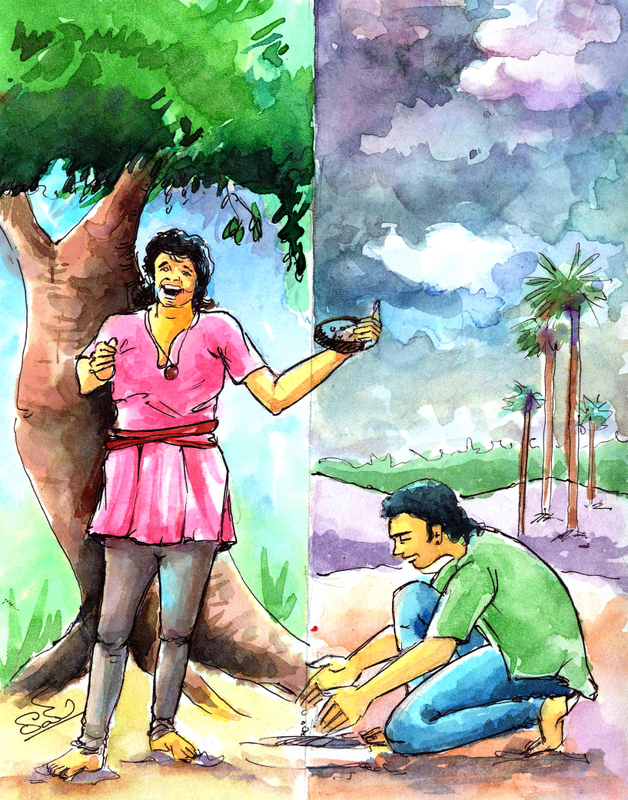 ఇక భీమరాజు పడమటి దిక్కుగా ప్రయాణించి, ఒక పచ్చని ఊరు చేరుకు-న్నాడు. అక్కడ పదిమందినీ విచారించి, చిన్న భూమి ఒకదాన్ని కౌలుకు తీసుకున్నాడు. తను తీసుకెళ్ళిన శనగ విత్తనాల్ని ఆ భూమిలో నాటి, అందరిలాగే కష్టపడ్డాడు. ఊళ్ళో- వాళ్ళంతా 'అబ్బ! భీముడు మంచి పనిమం-తుడబ్బా' అనుకునేట్టు పనిచేశాడు. ఐదు నెలలు గడిచేటప్పటికి అతని విత్తనాలు అతనికి తిరిగి రావటమే కాదు; చాలా లాభం కూడా వచ్చింది. ఆ డబ్బుతో అతనొక చిన్నపాటి చేనును కొనుక్కున్నాడు కూడా. అలా సంవత్సరం తిరిగేటప్పటికి, తను ఒక్కడే తినటం కాదు; పదిమందికి అన్నం పెట్టే స్థితికి చేరుకున్నాడు.
