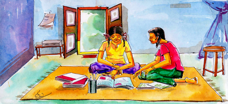 జింకలవంక అనే ఊళ్లో గీత, రాధ అనే పిల్లలు తొమ్మిదవతరగతి చదువుతున్నారు. గీతకేమో లెక్కలు బాగా వచ్చు; ఇంగ్లీషు అంత బాగా రాదు. రాధకేమో ఇంగ్లీష్ బాగా వచ్చు; లెక్కలు బాగా రావు. అయితేనేమి, ఇద్దరూ మంచి స్నేహితులు కదా! గీత రాధకు లెక్కలు నేర్పేది. రాధ గీతకు ఇంగ్లీష్ నేర్పేది. ఇలా ఒకరి దగ్గర ఒకరు నేర్చుకోవాలంటే కలిసి చదువుకోవాలికదా? అందుకని వాళ్ళిద్దరూ ఒక రోజు గీత వాళ్ళింటి దగ్గర, ఒక రోజు రాధ వాళ్ళింటి దగ్గర కూర్చొని చదువుకునేవాళ్ళు. అట్లా కలిసి మెలసి చదువుకుంటూ బళ్ళో 'భలే పిల్లలు, బాగా చదువుతారు' అని పేరు తెచ్చుకున్నారు ఇద్దరూ.