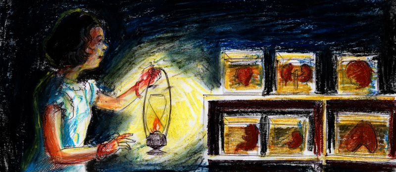సరే, ఈ పాప కాలేజీకి చేరుకునేసరికి చీకటి పడుతున్నది. కాలేజీలో ఎవ్వరూ లేరు. ప్రయోగశాలలో చుట్టూ సీసాలు..సీసాల్లో ఫార్మాలిన్ ద్రవంలో- ఒక్కోదానిలో ఒక్కో శరీర భాగం తేలుతూ ఉన్నది- ఒక సీసాలో మెదడు, ఒక సీసాలో కాలు, ఒక దానిలో చెయ్యి, ఒకదానిలో గుండె- ఇలాగ. అంతటా నిశ్శబ్దం అలుముకుని ఉన్నది. మధ్యలో బల్లమీద మానవ కళేబరం పెట్టి ఉంది, కదలకుండా పడి ఉన్నది ఒక శవం!