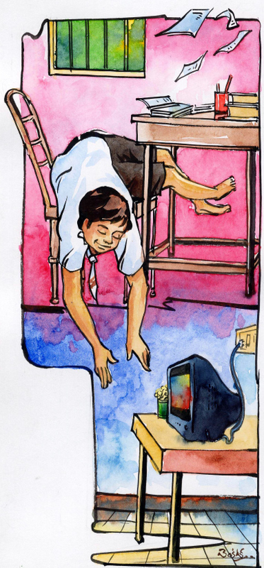 వాళ్ల ఇంటికి మరి టి.వి. ఎలా వచ్చిందంటే, రవికి ఒక చిన్న తమ్ముడు ఉన్నాడు-శివ. ఆ శివకు ఒక స్నేహితుడు ఉన్నాడు. వాడి పేరు రాము. రాము వాళ్ళ ఇంట్లో టి.వి. ఉంది. రోజూ శివకు తను ఇష్టంగా చూసే టి.వి.ప్రోగ్రాముల గురించి చెబుతుండేవాడు. శివకు కూడా వాటిని చూడాలని ఒక కోరిక కలిగింది. వాళ్ళ నాన్నమీద ఎంతో ఒత్తిడి పెట్టాడు. చివరికి వాళ్ల ఇంటికి టి.వి. రాక తప్పలేదు. శివ తన మిత్రుడు రాము చెప్పిన ప్రోగ్రాంలు చూస్తూండేవాడు. క్రమంగా రవికి కూడా ఆ వ్యాధి సోకింది. వెంటనే తన చదువు పోయింది! రాత్రులు పన్నెండు గంటలవరకు టి.వి. చూడటం, ఉదయం లేట్ గా లేవడం, సోమరిలాగా తయారు కావటం!