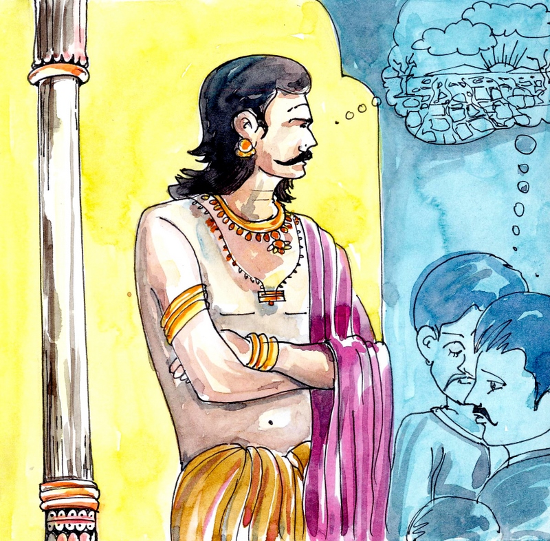 "ఈ సంవత్సరమే వానలు పడాలంటే ఏం చేయచ్చో చెప్పండి" అన్నాడు మహారాజు. రాజగురువు ముందుకు వచ్చాడు. తను శాస్త్రాల్లో వెతికి కనుగొన్న విషయాన్ని చెప్పాడు- "రాజ్యానికి చాలా దూరంలో దట్టమైన అడవి ఉంది. ఆ అడవిలో ప్రత్యేకమైన వృక్షం ఒకటి ఉంది. దాని కొమ్మను తీసుకువచ్చి నాటితే చాలు- వెంటనే వర్షాలు కురుస్తాయి" అన్నాడు.