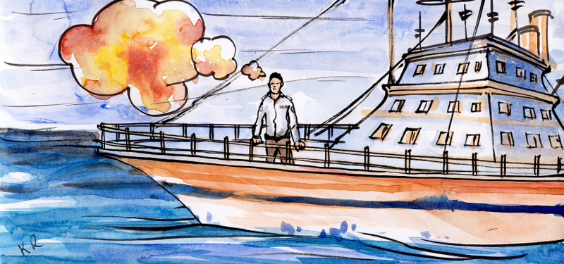 ఆరోజు సాయంత్రం తెరచాప త్రాళ్లను పరిశీలిస్తున్న ఓ కళాసీకి దూరంగా సముద్రంలో ఏదో నలుసులాంటి వస్తువు దర్శనమిచ్చింది. నిముష నిముషానికి అది పెద్దదైంది..చాలా వేగంగా అది వాళ్లవైపుకు దూసుకు రాసాగింది. 'అదొక యుద్ధనౌక' అని కళాసీ గుర్తించే సరికి అది చాలా దగ్గరికే వచ్చేసింది. దానిమీద ఉన్న జెండాను చూసేటప్పటికి అతనికి మూర్ఛ వచ్చినంత పనైంది- "సముద్రపు దొంగలు! సముద్రపు దొంగలు!" అన్న వెర్రికేక వెలువడింది అతని నోట్లోంచి!