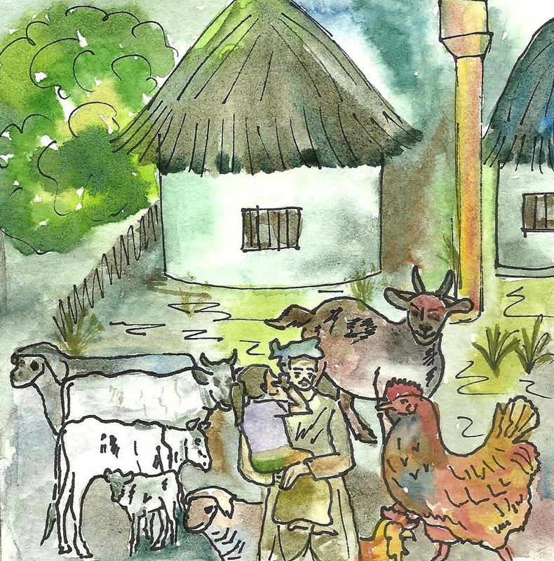 చూస్తే ఆ పాప ఆశ్చర్యపడిపోయింది: ఆ ఇల్లు చిన్న ఇల్లుకాదు - రాజుగారి ఇల్లులాగా పే...ద్ధగా ఉంది! దాని మధ్యలో చాలా చాలా మేకలు, గొర్రెలు , ఆవులు, అన్నీ చక్కగా తిరుగుతూ ఉన్నై!! ఒక పెద్దాయన వాటన్నిటికీ నీళ్లు పెడుతున్నాడు.