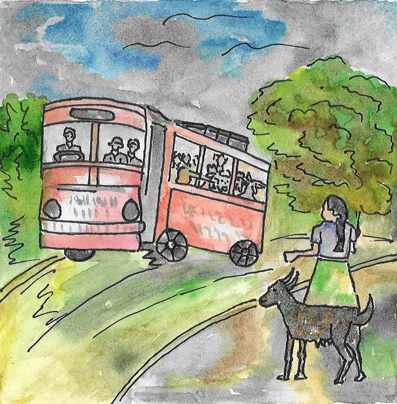 అంతలో రోడ్డు మీదికి ఒక బస్సువచ్చింది. అలేఖ్యను చూసి ఆగిందది. దానిలో నిండా చాలామంది జనాలు, కోళ్లు, మేకలు , జీవాలు- అందరూ పోతున్నారు.
