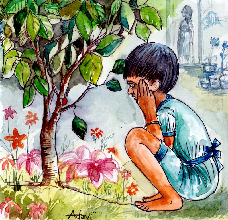 సూర్యకిరణంతనదారిన తను నేలమీద పడి కదలకుండా కూర్చున్నది. అమ్మ ఒక్క క్షణం అక్కడే నిలబడి సీరియస్గా చూసింది. మళ్ళీ చేస్తున్న పని గుర్తుకొచ్చి, లోపలికి వెళ్ళిపోయింది.