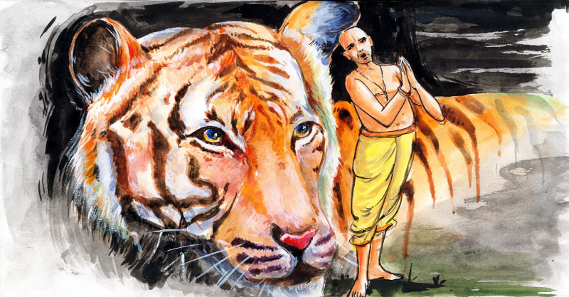 అకస్మాత్తుగా ఒక పులి వచ్చి అతనికి ఎదురుగా నిల్చున్నది . దైవభక్తుడు భయంతో గజగజ వణికాడు. తప్పించుకునే అవకాశం లేదు. ఎలాగూ పులి తనను తినేస్తుంది. ఆ సమయంలో అతనికి దేవుడు గుర్తుకొచ్చాడు. "స్వామీ! ఇక నా భారం నీదే" అని కళ్ళు మూసుకొని దేవుణ్ణి ప్రార్థించడం మొదలుపెట్టాడు.