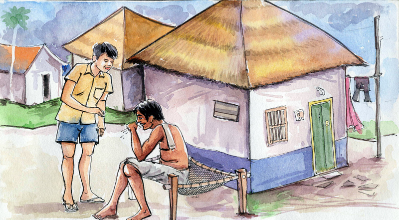 పెద్దలు మాత్రం కొందరు అక్కడక్కడా అరుగుల మీద, నీరసంగా కూర్చుని ఉన్నారు. నవ్వులు లేవు; మామూలుగా ఉండే పలకరింపులూ లేవు! డౌసు ఇంటికి వెళ్ళే దారిలో చాలా మంది మంచాల మీద మూలుగుతూ పడుకుని ఉన్నారు. "ప్రొద్దునపూట ఈ పడుకోవటం ఏందబ్బా?" అనుకుంటూ వాడు ఇల్లు చేరేసరికి ఇంటి ముందు మంచం వేసి ఉంది- దాని మీద వాళ్ళ నాన్న పడుకుని ఉన్నాడు!