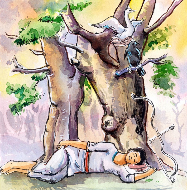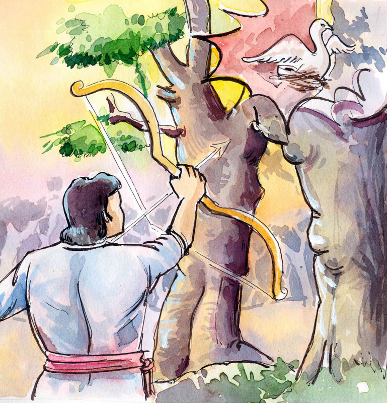 సరే, ఇంకేముంది? బాటసారికి నిద్రాభంగమైంది. వాడు కళ్ళు తెరిచి అటూ ఇటూ చూశాడు. చెట్టుమీద రెక్కలు చాపుకొని కూర్చున్న హంస కనబడింది వాడికి. తన ముఖం మీద రెట్టవేసింది అదే అనుకున్నాడు వాడు. దాంతో వాడికి దానిమీద చాలా కోపం వచ్చింది. అప్పటికే ఎక్కుపెట్టి ఉన్న విల్లును తీసుకొని వాడు ఒక్క బాణంతో హంసను నేలకూల్చాడు. ఏ పాపం ఎరుగని ఆ అమాయకపు హంస తోటి హంసల ఆశలన్నిటినీ బూడిద చేస్తున్నట్లు నేలరాలి ప్రాణం విడిచింది.