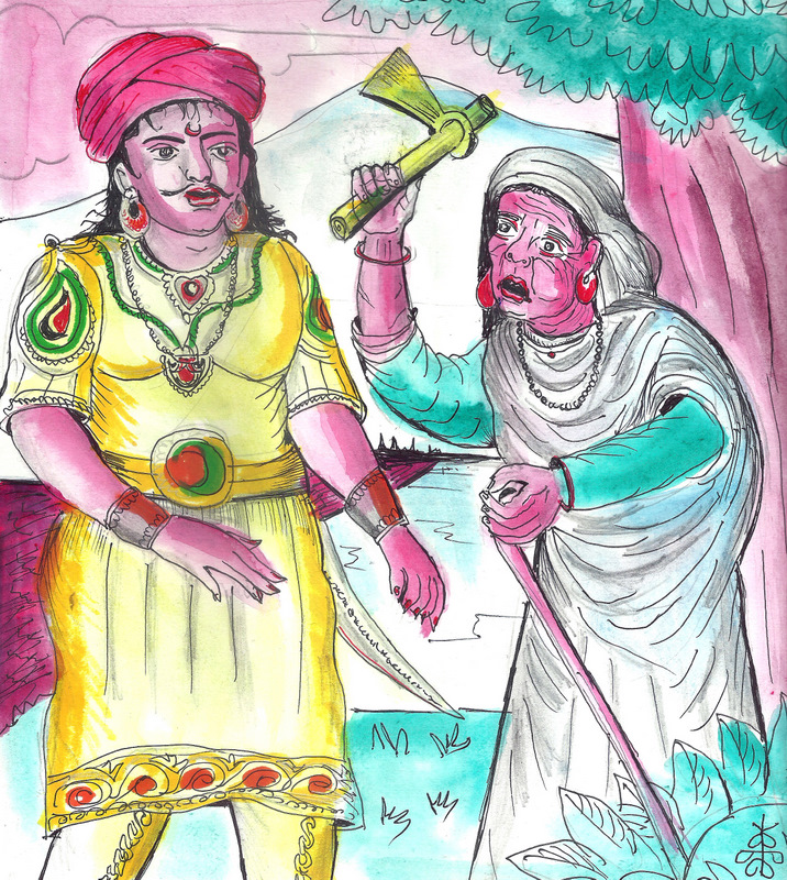 అవ్వ కోపంతో ఊగిపోయింది. "కాదు నాయనా, కాదు! నా ప్రయత్నం కట్టెపుల్లల కోసం కాదు! నా కొడుకులందరినీ పొట్టన పెట్టుకొన్న రాక్షసుడు- ఆ అశోకుణ్ణి రేపటి యుద్ధంలో హతమార్చనున్నాను నేను. నాతో పాటు నాలాంటి వేలాది తల్లుల ఉసురు పోసుకున్న ఆ దుర్మార్గుడు ఊరికే చావడు! ఈ గొడ్డలికి ఎంత పదును పెడతానంటే, దీనితో ఒక్క వేటుకు వాడి తల తెగి పడాలి!" అని అరిచింది.