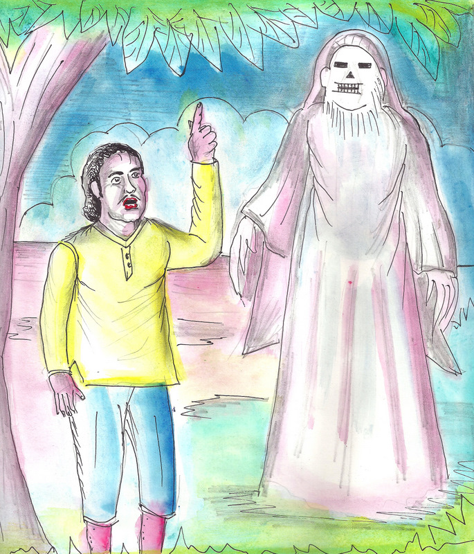 ఒళ్ళంతా దుస్తులు ఉన్న ఒక ఆకారం గాలిలో తేలుతూ అతని ముందుకు వచ్చింది. దాని నోట్లో కోర పళ్ళు రెండు తళుక్కుమని మెరిసాయి. "ఎవరండీ మీరు? మీకు దారి చూపించాలా?" అడిగాడు రంగన్న, భయపడుతూనే.