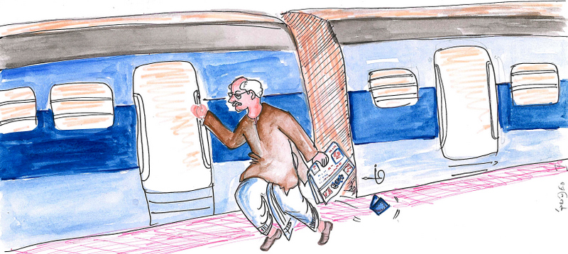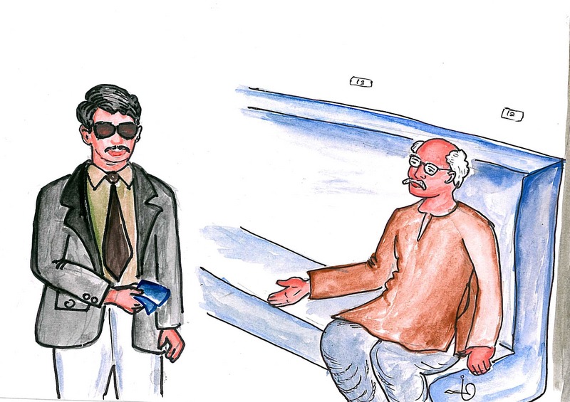 రైలు విజయ నగరంలో ఆగింది. రాంనాథం గారు ఓమాటు రైలు దిగారు. ఆ రోజు దినపత్రిక కొని, మళ్లీ రైలెక్కారు. పేపరు చదువుతుండగా వినబడింది- "టికెట్ టికెట్" అని. తల త్రిప్పి చూశారు. ఎదురుగా రెండుమూడు వరసల ముందునించి టికెట్లు తనిఖీ చేస్తూ వస్తున్న అధికారి కనబడ్డాడు. రాంనాథం గారు లేచి నిల్చున్నారు. టికెట్ తీసుకుందామని తన లాల్చీ జేబులో చెయ్యిపెట్టారు. జేబు ఖాళీగా చేతికి తగిలింది!