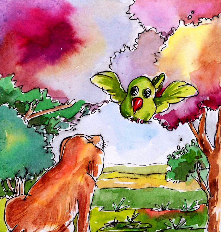 మెల్లగా నడుస్తూ వెళుతున్న చిన్ని రామచిలుకని చూసిన బుజ్జి కుక్కపిల్ల "చిన్నీ! ఆగు - ఆగు. ఎక్కడికి, వెళుతున్నావు" అని అడిగింది తల పైకెత్తి చూస్తూ.