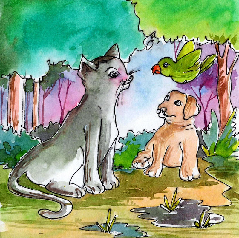 ముగ్గురూ వెళుతూ వెళుతూ ఉండగా చెట్టు మీద కూర్చుని పాటలు పాడుకుంటున్న కోకిల వీరిని చూసి పాట ఆపి "ఓ బుజ్జీ, చిన్నీ- ఎక్కడికెళుతున్నారు, ఈ వాగుడు పిల్లిని తీసుకొని?" అంది. దాని మాటలకు పిల్లి మూతి ముడుచుకుంది.