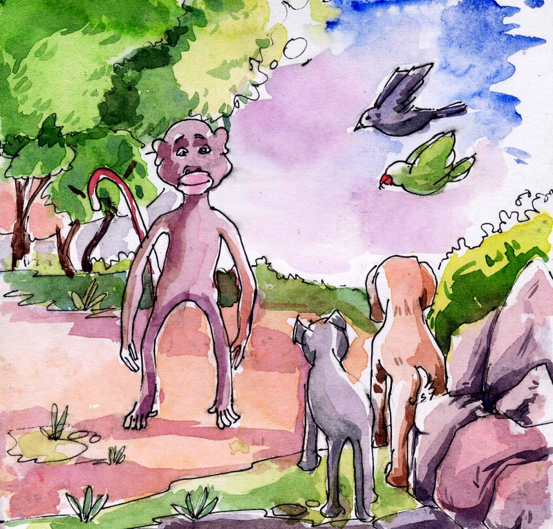 నలుగురూ వెళుతూ వెళుతూ ఉండగా ఏమీ తోచక అటూ ఇటూ అనవసరంగా గంతులు వేస్తున్న కోతి వీరిని చూసి వాళ్ళ దగ్గరకు పరిగెత్తుకు వచ్చి