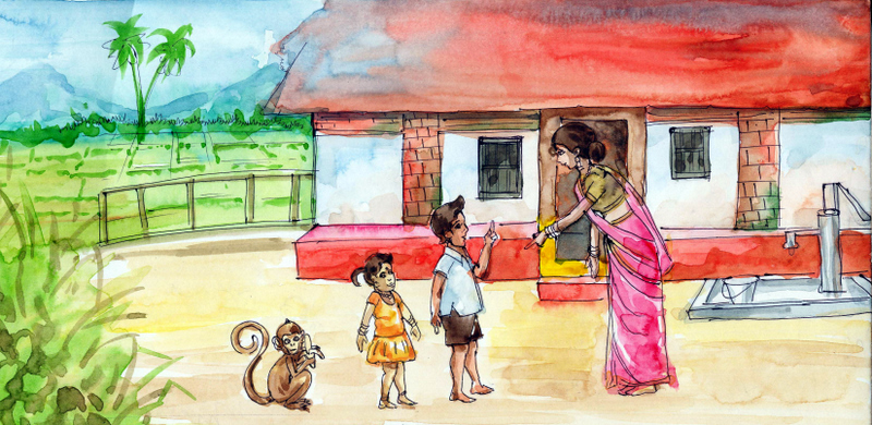 వాళ్ల చేతుల్లో ముడుచుకొని కూర్చున్న కోతిని చూడగానే అమ్మ ఒక్కసారి అదిరిపోయి "గయ్.."మని అరిచింది- "ఏయ్..ఏంటి, ఈ కోతిని నేరుగా ఇంట్లోకే తీసుకొచ్చారు? ఛీ..ఛీ.. ఇది చాలా మురికిగా ఉంది! బయట వదిలెయ్యండి!" అరిచింది అమ్మ.