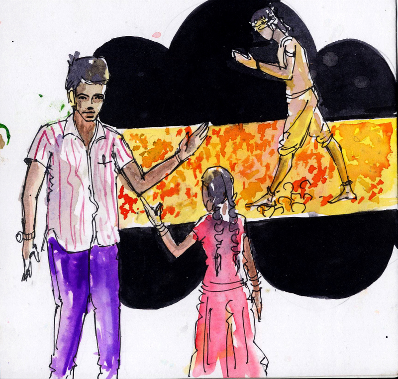 రాముడి కూతురు వెన్నెల అక్కడే ఓ ప్రక్కగా నిలబడింది. పరుషలో జరుగుతున్న తంతుల్ని వివరంగా గమనిస్తున్నది. అక్కడ వరాలు అడగడానికి నిలబడ్డ ఆడవాళ్ళు ఆ పాప దృష్టిని ఆకర్షించారు. ఇంతలో ఏమైందో, వాళ్లలో ఒకామె వేపమండలు చేతపట్టుకొని, పెద్దగా అరుస్తూ గంతులు వేయటం మొదలు పెట్టింది. అక్కడికి పరుగున వచ్చిన డప్పులవాళ్ళు 'జజ్జనక' అని దరువులు వేయసాగారు. ఆ దరువుల వెంబడి ఆమె ఏదో మత్తులో ఉన్నట్లు అటూ ఇటూ ఊగిపోవటం మొదలు పెట్టింది. "ఏమైంది నాన్నా, ఆమెకు?" అని అడిగింది వెన్నెల. "పెద్దమ్మ పూనింది తల్లీ! ఆమె శరీరం ఇప్పుడు పెద్దమ్మకు ఆశ్రయం అయిపోయింది. ఆమె ద్వారా పెద్దమ్మ పలుకుతుంది ఇప్పుడు" అన్నాడు రాముడు, భక్తితో కళ్ళు మూసుకుంటూ. ఆ పెద్దమ్మ పూనిన తల్లి ఇప్పుడు గబగబా నిప్పులున్న వైపుకు పరుగు పెట్టింది.