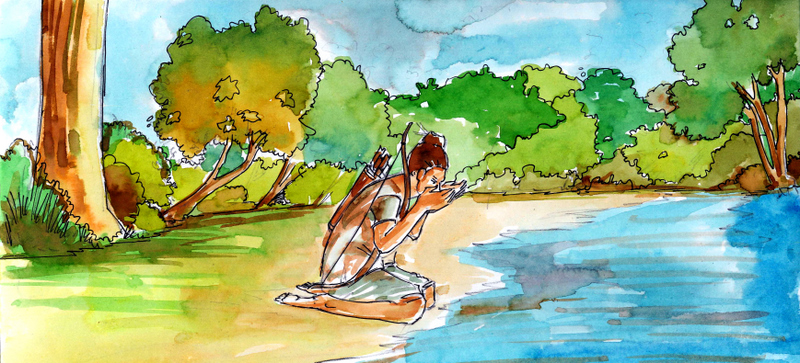 "ఇంతకు ముందు నువ్వు నీళ్ళు ఎలా త్రాగావో చూపించు" అన్నాడు విలుకాడితో. విలుకాడి భుజానికి గతంలో లాగానే ధనస్సు వ్రేలాడుతున్నది.