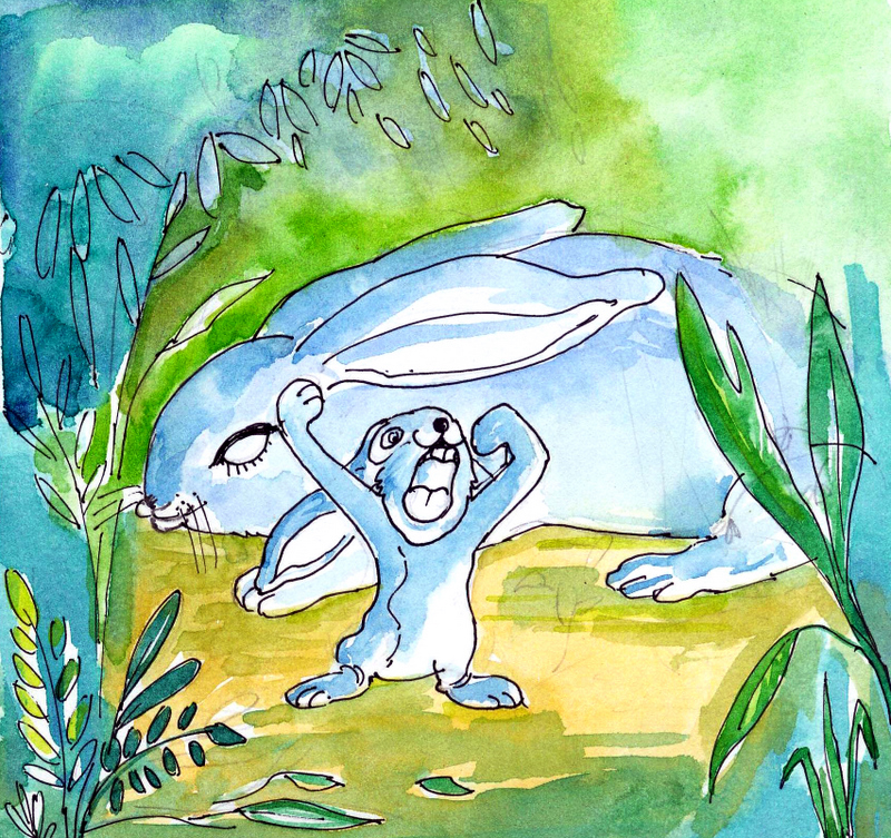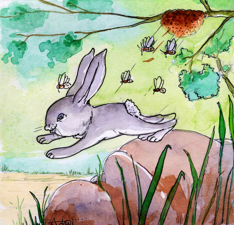 కుందేలు అక్కడికి వెళ్ళి, పొడుగాటి కర్ర ఒకటి తీసుకొని, ఆ తేనె పట్టుని చటుక్కున కదిలించింది. అంతే- తేనెటీగలన్నీ ఝుమ్మని ఒక్క సారిగా లేచి కుందేలు వెంటపడ్డాయి- కుందేలు బెదిరిపోయి ఒకటే పరుగు- తన పొదలోకి వచ్చి దూరినా ఆపలేదు!