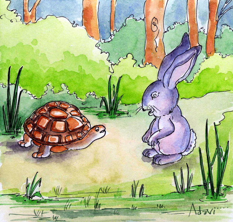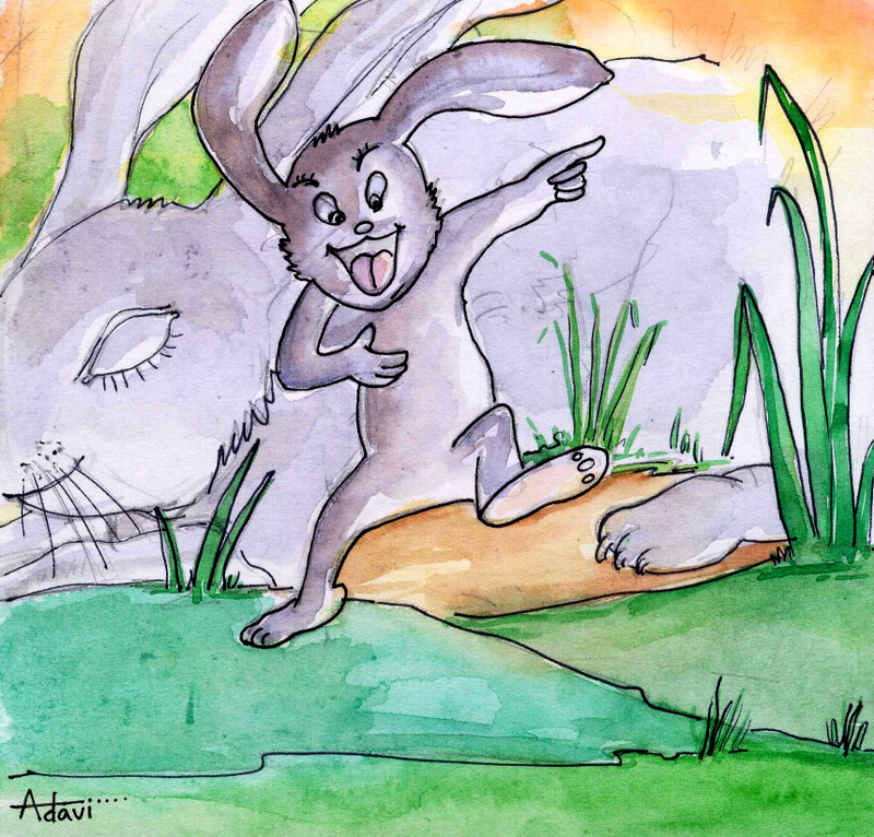 అది విని తాబేలు "మీ కుందేళ్ళకు కాలి దురద ఎక్కువ. ఎప్పుడూ కాలుకాలిన పిల్లిలాగ అటూ ఇటూ గెంతుతూ ఉండకపోతే, మాలా నెమ్మదిగా నడవటం నేర్చుకోవచ్చు కదా? ఒకప్పుడు మీ తాత తను వేగంగా పరిగెత్తగలననుకొని, నాతో పరుగు పందెం వేసుకొని ఓడిపోయాడు తెలుసా? ఎప్పుడైనా నిదానమే ప్రధానం, ఊరికే పరుగులెత్తి ఏమీ సాధించలేరు" అని తన దారిన తను వెళ్ళిపోయింది.