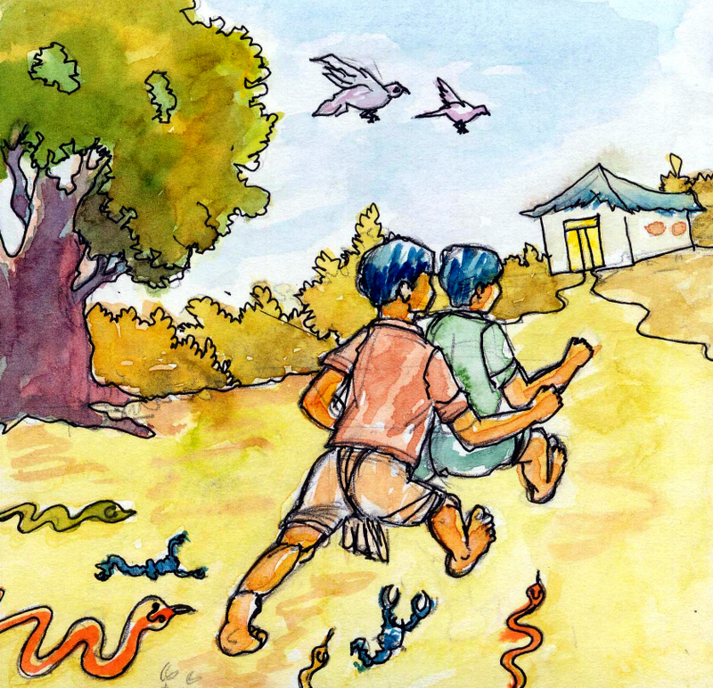 "నేను ముందు కోస్తా ! నేను ముందు కోస్తా !" అని పోట్లాడుకొని వాళ్ళిద్దరూ గబగబా కాయలన్నీ కోసుకొని ఇంట్లో కుప్ప చేసారు. "చూడనివ్వురా, ఒక్కోదాంట్లో ఎంత బంగారం ఉందో!" అని వాళ్ళు ఆ కాయల్ని కోసి చూస్తే ఏముంది- ప్రతి కాయలోనూ పాములు తేళ్ళు ! ఆ పాములు, తేళ్ళు వెంటపడి తరిమేసరికి అన్నలిద్దరూ ఊరువిడిచిపెట్టి పారిపోవాల్సి వచ్చింది!
